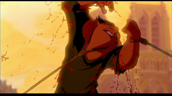 Julianne: It’s an incredibly upsetting scene—one that I am amazed the Disney animators would create and seem to have no concept of how horrifying it would be to their target audience. Quasimodo is an incredibly likable, sympathetic protagonist. Tom Hulce, the actor who voices Quasimodo, is fantastic. His voice is both light and playful, while maintaining a melancholic and despairing undertone. He has a delicate balance to maintain it, and he does it very well. He has our sympathies almost instantly, and having this happen to him is horrifying.
