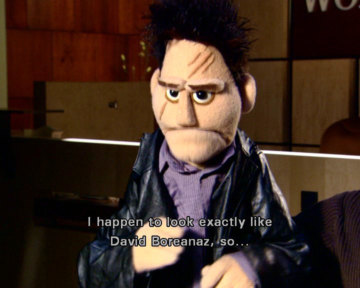 This puppet humor is in keeping with recent (Neil’s Puppet Dreams) and upcoming projects (The Muppets…Again!, Happytime Murders) and the continued presence of the Sesame Street-spoofing musical Avenue Q Off-Broadway in New York. However, Community is going to turn human characters into puppets as opposed to strictly having human characters interacting with puppets. That’s kind of new. 30 Rock did something similar, in a far more limited fashion, when Kenneth saw the world in puppet form. However, the gold standard is and probably will continue to be the masterful season 5 episode of Joss Whedon’s Angel: “Smile Time,” in which David Boreanaz’ lead character is turned into “a wee-little puppet man.”