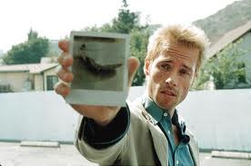 Like Following, once you put the film’s plot in linear order, it becomes clear that the storyline is not particularly complicated, but where Following’s jumbled narrative felt like an unnecessary distraction, Memento’s structure enhances the viewing experience. The viewer is elated and thrilled by the film’s confusing, out of order plot, desperate to keep up. It also conceals the fact that Leonard is probably not a central character to be trusted. After all, he only knows what is written down in his notes and on his photos. There’s a scene in which a character, seeking to manipulate him, comes into his/ her home and immediately hides all of his/ her pens. Without access to any writing utensil, he cannot remind himself of what has transpired and major character developments are forgotten. We see how easily he can be manipulated, but we still assume we are getting the most important aspects of the narrative. The viewer trusts his perceptions implicitly because we are just as disoriented. We only know his perspective, and even though his perspective is fragmented and distorted, we have no choice but to accept his claims.