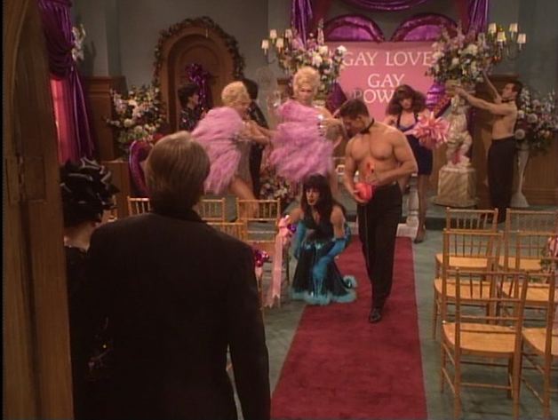 Probably the most stereotypical wedding on television is the one where everything is a disaster. Cheers, Frasier, and Wings all did episodes like that to perfection. What about an episode where everything is a disaster but the couple just happens to be two dudes? That was Roseanne’s “December Bride” in which Roseanne steps in to help plan the wedding ceremony for her boss Leon to his partner Fred, both of whom were long-time recurring characters at that point. As seen in the above picture, Roseanne’s vision for how the wedding should look is chock-full of gay stereotypes, and not at all what the actual couple wants.