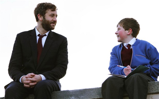 Of course, the playfulness of Moone Boy is established well before either of these scenarios play out.  In fact, there is a rather high-concept to the show which is presented in the opening minute – Martin sees and talks to an imaginary friend named Sean Murphy (Chris O’Dowd, who you most likely know as Kristen Wiig‘s love interest in Bridesmaids), who is almost always seen in a black suit with a red tie.  Sean is also the show’s rather blunt narrator (e.g., accurately describing Martin’s efforts to figure out which of his sisters has the biggest boobs as being “clueless”).