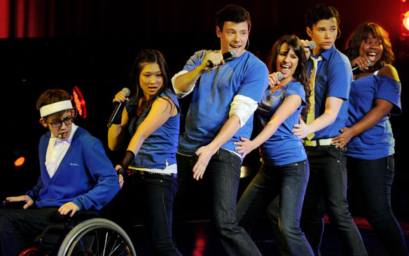 The original 6 members of the show choir on Glee – Artie, Tina, Finn, Rachel, Kurt,  and Mercedes (left to right). These are the 6 oddballs America fell in love with in 2009.