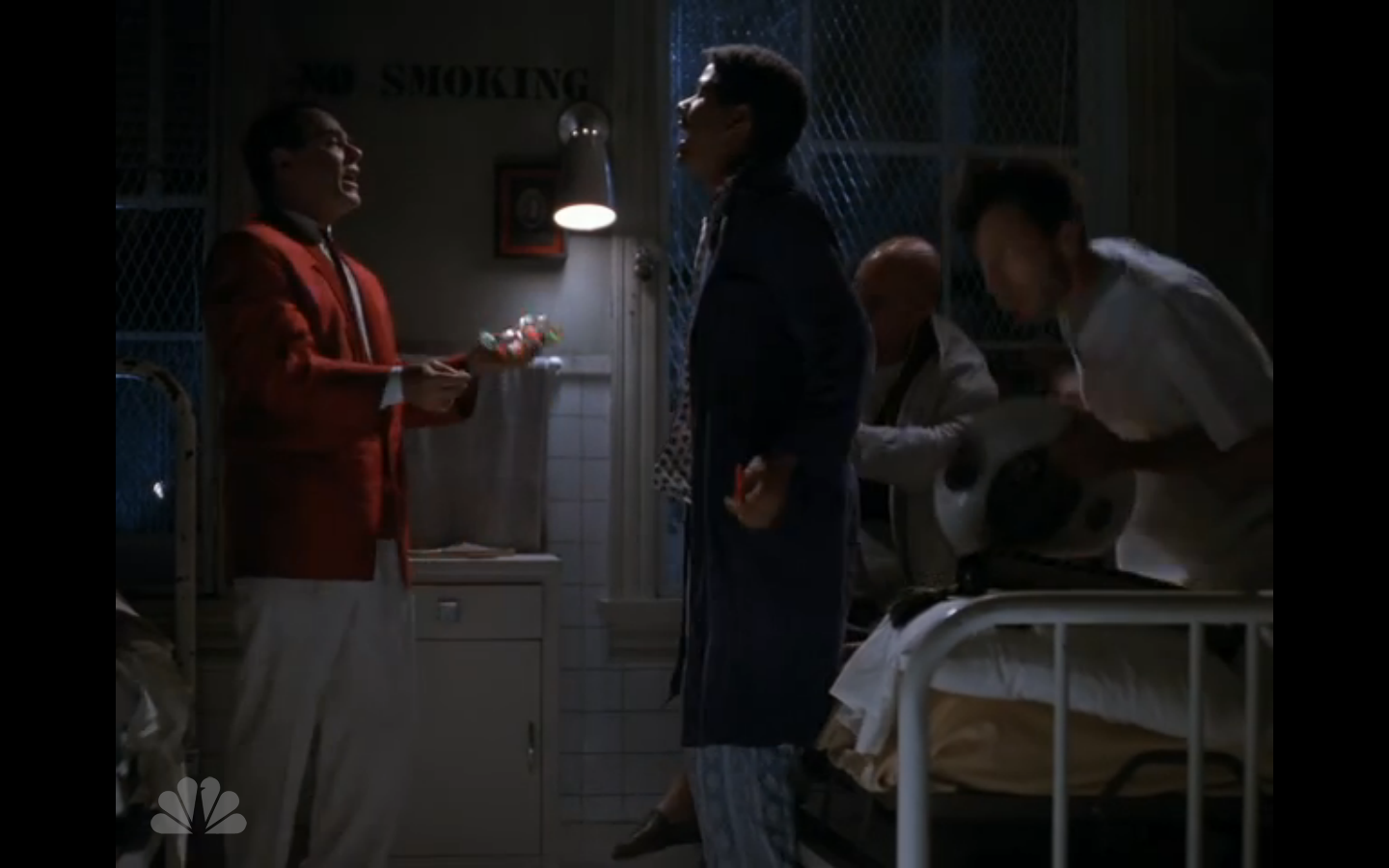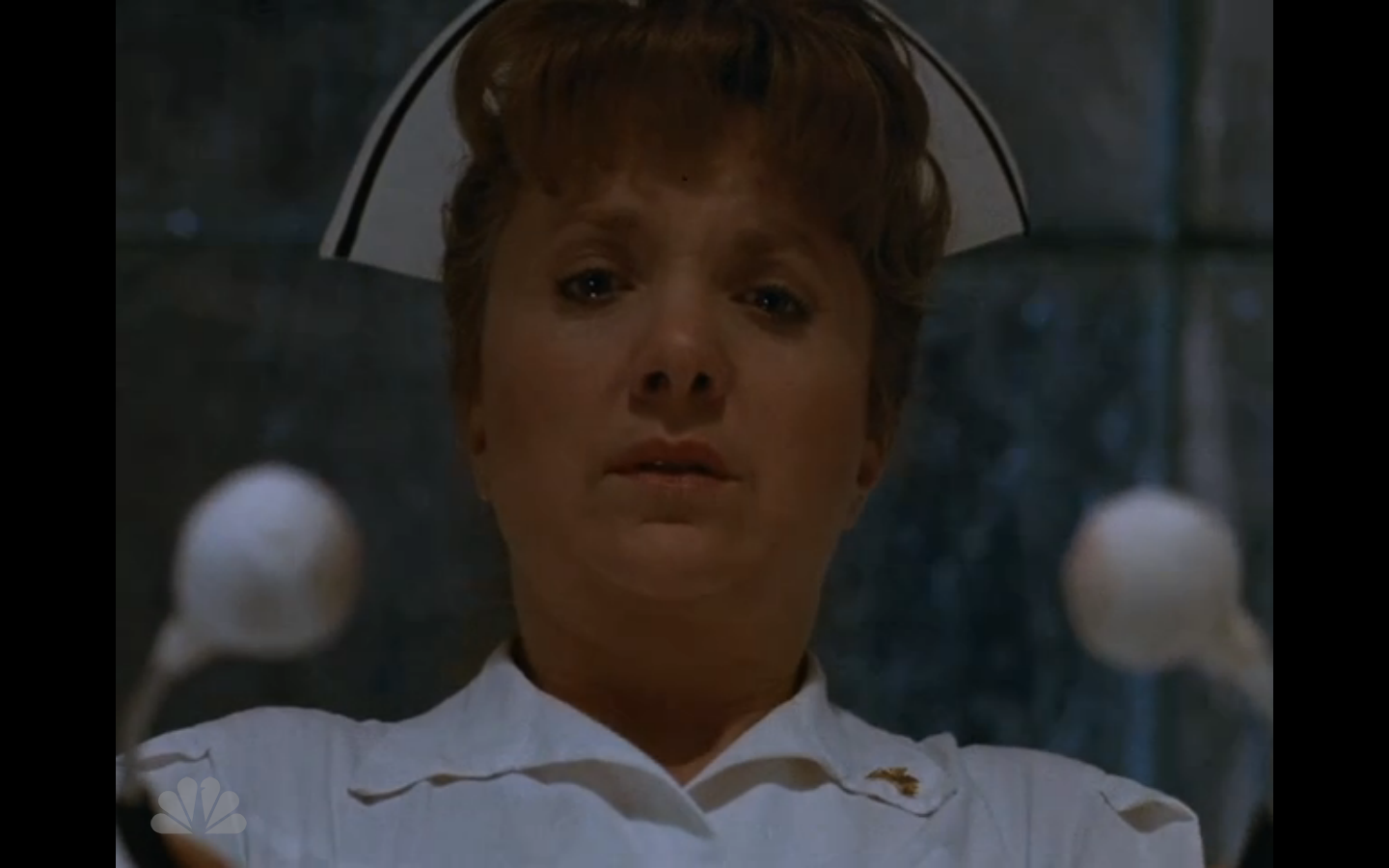 Waaaaaaaiiiiiiiit a minute here. I get that the historic period of the episode (specifically 1954) is meant to comment upon the early days of medicine in relation to mental health and conditions like multiple personality disorder or schizophrenia. In that way, this is Quantum Leap‘s own version Sybil. Al even references Sybil in the episode! So, none of the doctors or nurses truly know what the heck is going on with Sam. However, even though a perfectly timed dosage of electroshock at the same near-fatal dosage as the therapy that triggered the multiple personality disorder is what Sam needs it’s not necessarily what the person he leaped into needs nor is it medically advisable. In the course of the episode, the generally sympathetic nurse argues that 200V is a potentially fatal voltage, administering electroshock therapy twice in 48 hours could kill the patient and that only doctors are allowed to administer the therapy, a fact confirmed by one of the doctors. Yet she is the one to administer electroshock to Sam at 200V while the Doctor and orderly are arguing. This is supposed to be a big, heroic moment, but, wait, didn’t the episode establish that what she does could actually kill the patient? Yep, pretty effectively, too.
