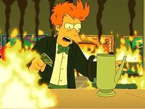 Why It’s Awesome: This is Futurama‘s take on the classic The Simpsons episode “22 Short Films About Springfield” (the one where Lisa gets gum in her hair, Flanders stung by a bee, Apu closes the Kwik-E-Mart for an hour, etc.), a format designed to utilize a show’s deep roster of supporting characters.  However, it actually improves upon “22 Short Films” structure by creating a better defined actual plot reason for all of the characters splintering off, and brilliantly brings them together in the end.  Honestly, though, the main reason to watch this episode is Billy West’s inspired vocal performance as the increasingly caffeinated, almost Cornholio-esque (for you Beavis & Butthead fans) Fry, who uses his money to buy and drink 100 cups of coffee.