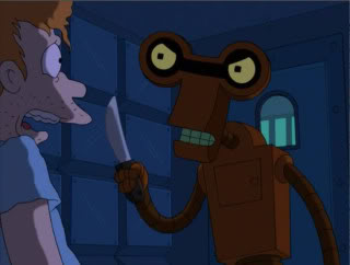 Why It’s Awesome: In classic Matt Groening show fashion, before we get to the heart of the episode, a fun One Flew Over the Cuckoo’s Nest parody with a literal deprogramming of Fry, we’ve had jokes about Zoidberg being poor and Fry having no real money to invest in anything.  Plus, we’ve been introduced to a fantastic new recurring character, the insane knife-wielding robot Roberto (“I’m not crazy; I’m just not user-friendly”), and enjoyed the returns of the recurring Judge Whitey (“I’m told by my caddy that a bank is where people keep money that is not properly invested”) and Hyper-Chicken lawyer (“Now I may just be a simple country Hyper-Chicken, but I know when we’re finger-licked”).  The element that puts this episode over the top, though, is the brilliant vocal performance of David Herman as Roberto, managing to walk the line between funny and genuinely threatening, like the way Roberto insists “It was NOT nothing!” when Bender assures him it was no big deal helping him break out of the insane asylum.