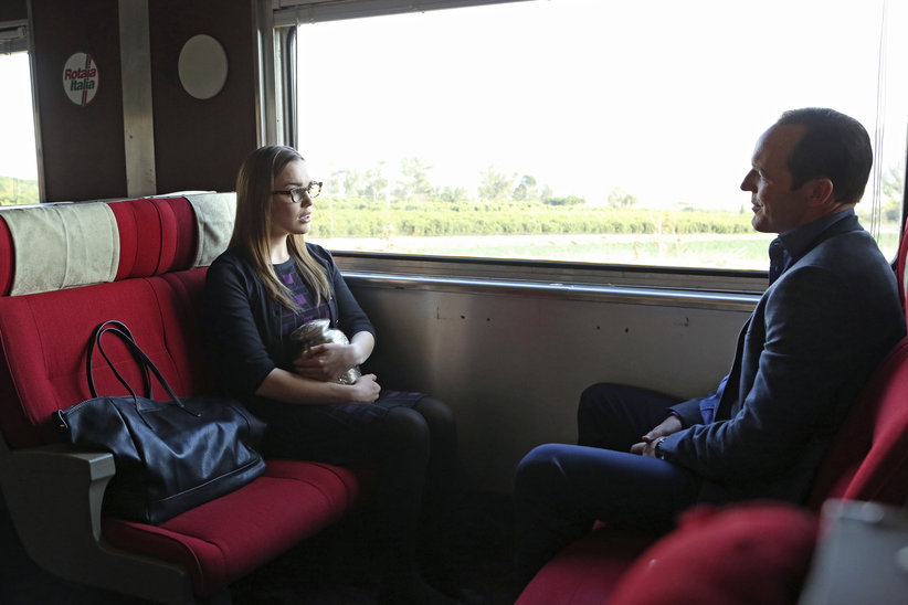 UNDERCOVER mission, y’all! Not sure why I felt the need to capitalize “undercover,” maybe just to emphasize that this means another episode in which the writers found a way to get our damn agents off the sterile, boring main sets comprising the interior of the Bus. The more this show does that the better off we’ll all be because the Bus=a deeply stupid main setting for a TV show. The gist is that the team is divided into pairs, Skye & Fitz and Ward & May each parading as couples while Coulson poses as Simmons’ American father. This set-up allows for moments of comedy for each pair before things go Mission Impossible on them when their cover is blown because the Clairvoyant warned the bad guys they were coming because he or she is, well, clairvoyant. We then see the events on and off the train from a different pair of or individual character’s perspective, going from Coulson and Ward to May to Fitz, Simmons, and Skye.