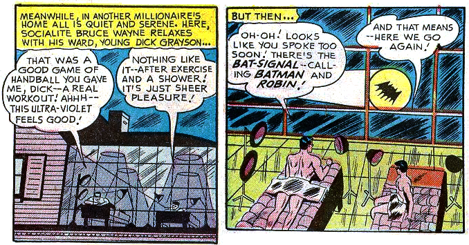 4) B. Batman and Robin have woken up in bed together, lay naked under sunlamps together, shared a rowboat in a city park, and Robin has even snuck up on Batman in the shower. They have never, however, been shown sharing a sleeping bag. So, yeah, crisis averted, right?