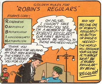 2) In Batman #1 (Spring 1940), readers were invited to join a club called Robin’s Regulars. This was a club whose motto was, “Be a Robin’s Regular by being regular.” This club followed a code inspired by the letter’s of Robin’s name: Readiness, Obedience, Brotherhood, Industriousness. What did the “N” stand for?