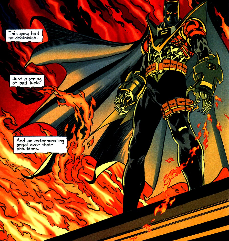 Why did Bruce Wayne ask somebody seriously named Azrael to become the new Batman when Dick Grayson was around as Nightwing, his adult crimefighter persona ? Is Dick Fredo to Azrael’s Michael Corleone, passed over because that’s the way pops wanted it to go? Actually, Wayne didn’t ask Grayson because he was afraid that his prodigal son would be compelled to go after Bane, despite orders, and surely die in the process. If Azrael did it, eh, it’s not like we knew him all that well or anything.