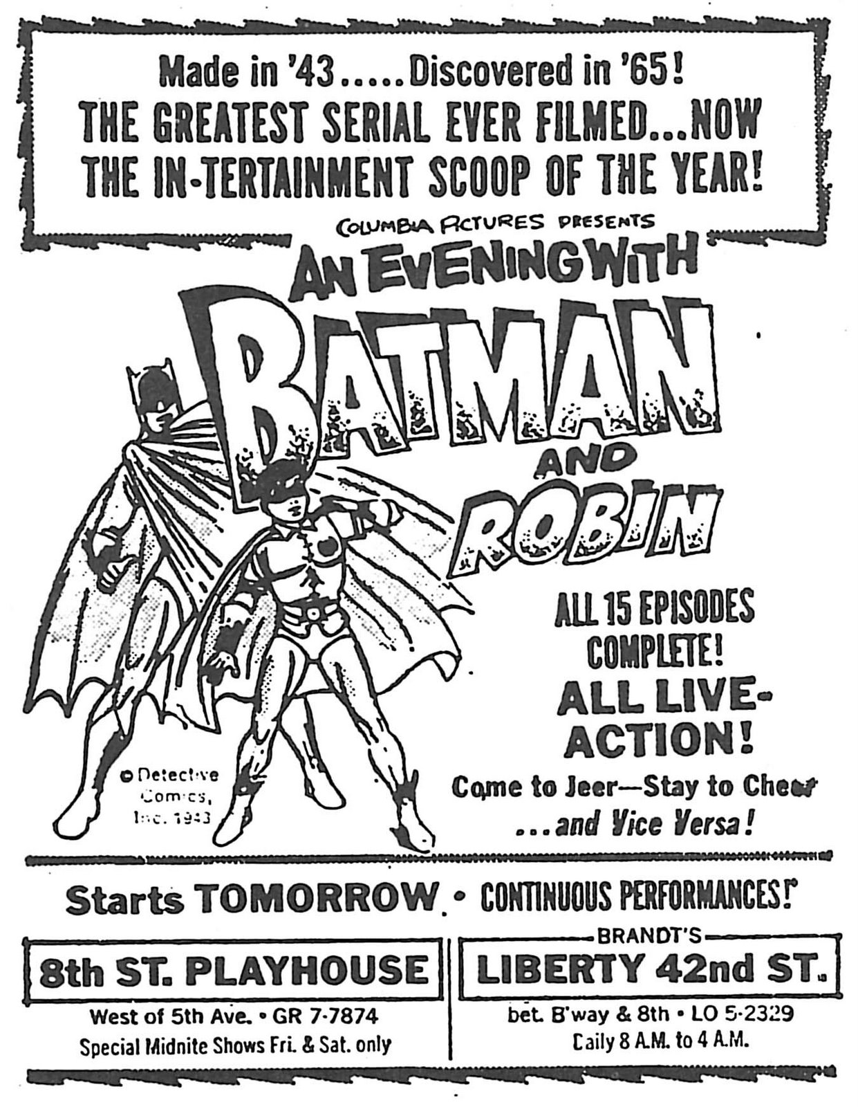 Columbia Pictures, the producer of the Batman serials, really liked that part about setting a new sales record. So, they re-packaged the 1943 and 1949 Batman serials into something they called An Evening with Batman and Robin, mimicking Playboy entirely by playing all 15 chapters of the individual serial in a 4-hour marathon. Columbia first tested the waters for An Evening with Batman and Robin in November 1965 at Cleveland’s Continental Theatre and at the Champaign Art Theatre in Champaign, Illinois. These screenings proved so successful that Columbia quickly booked the show in theaters in New Orleans, Kansas City, Louisville, Akron, Springfield, Tucson, Toledo, Fullerton, Denver, Dayton, Columbus, and Santa Ana, just to name a few.
