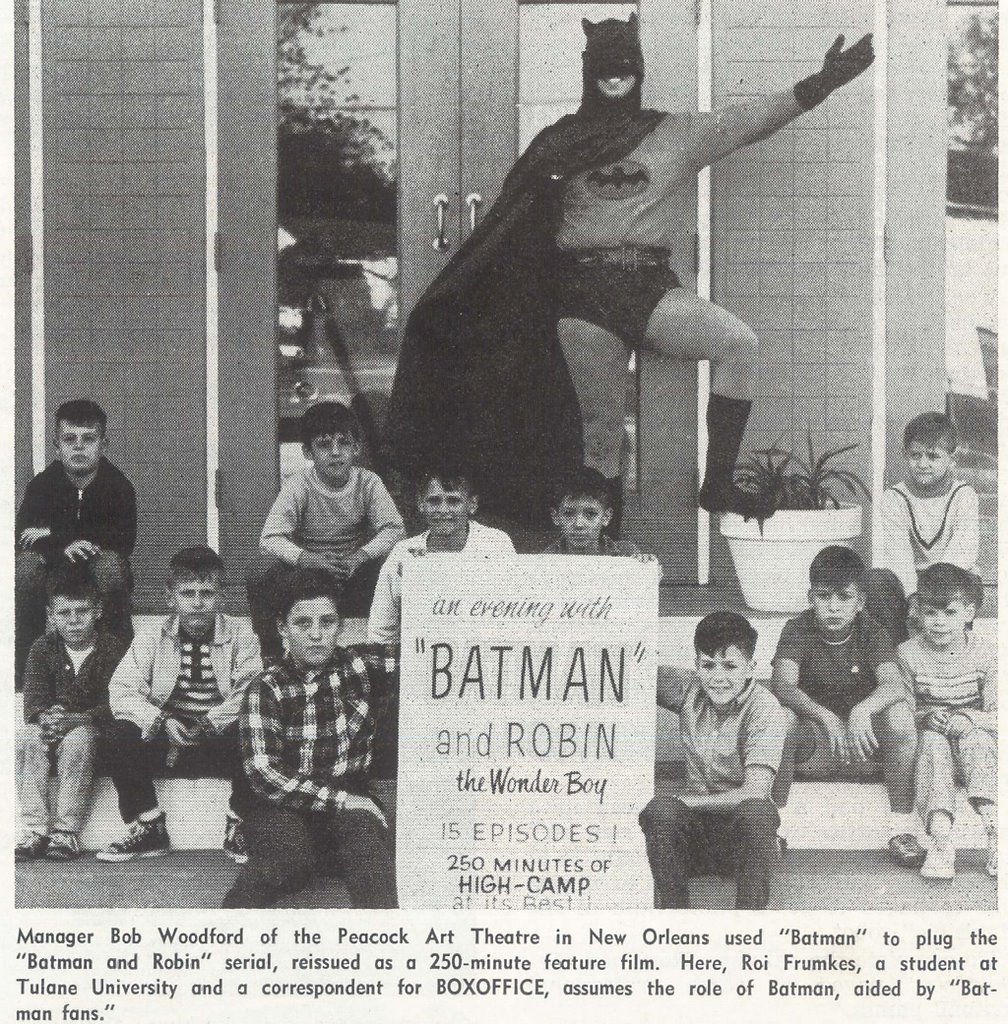 The Batman craze which so quickly emerged from the Adam West show was likely aided by Evening with Batman and Robin, which didn’t begin in earnest until two months prior to Batman‘s January 1966 debut and then continued well into 1966. Immediately prior to Adam West, you had things like a Tulane University senior dressing up in a home-made Batman costume to regale some seriously miserable looking kids awaiting their Evening with Batman outside New Orleans’ Peacock Theatre: