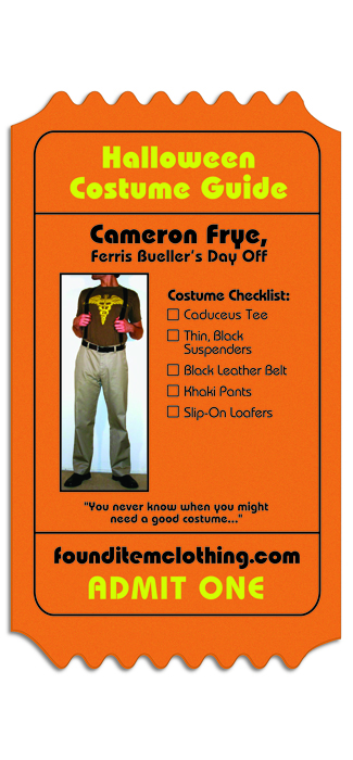 There is! (Hmm, did that sound a little info-mercially?) Well, there is if you want to dress up like a character from a beloved 80s film. FoundItemClothing.com, who I admit I was first made aware of when they recently contacted me through e-mail, has a special feature for Halloween they’re calling “An Obsessively Chronicled 80s Movie Costume Guide.” They have looked at movies like Dirty Dancing, Escape from New York, Sixteen Candles, Strange Brew, Heathers, Real Genius, Stand By Me, Teen Wolf, and The Lost Boys and created handy-dandy scorecards for all the costume items you can probably find in your own closet. For example, let’s say that I want to dress up like Cameron from Ferris Bueller’s Day Off? Well, they have a shopping list for that: