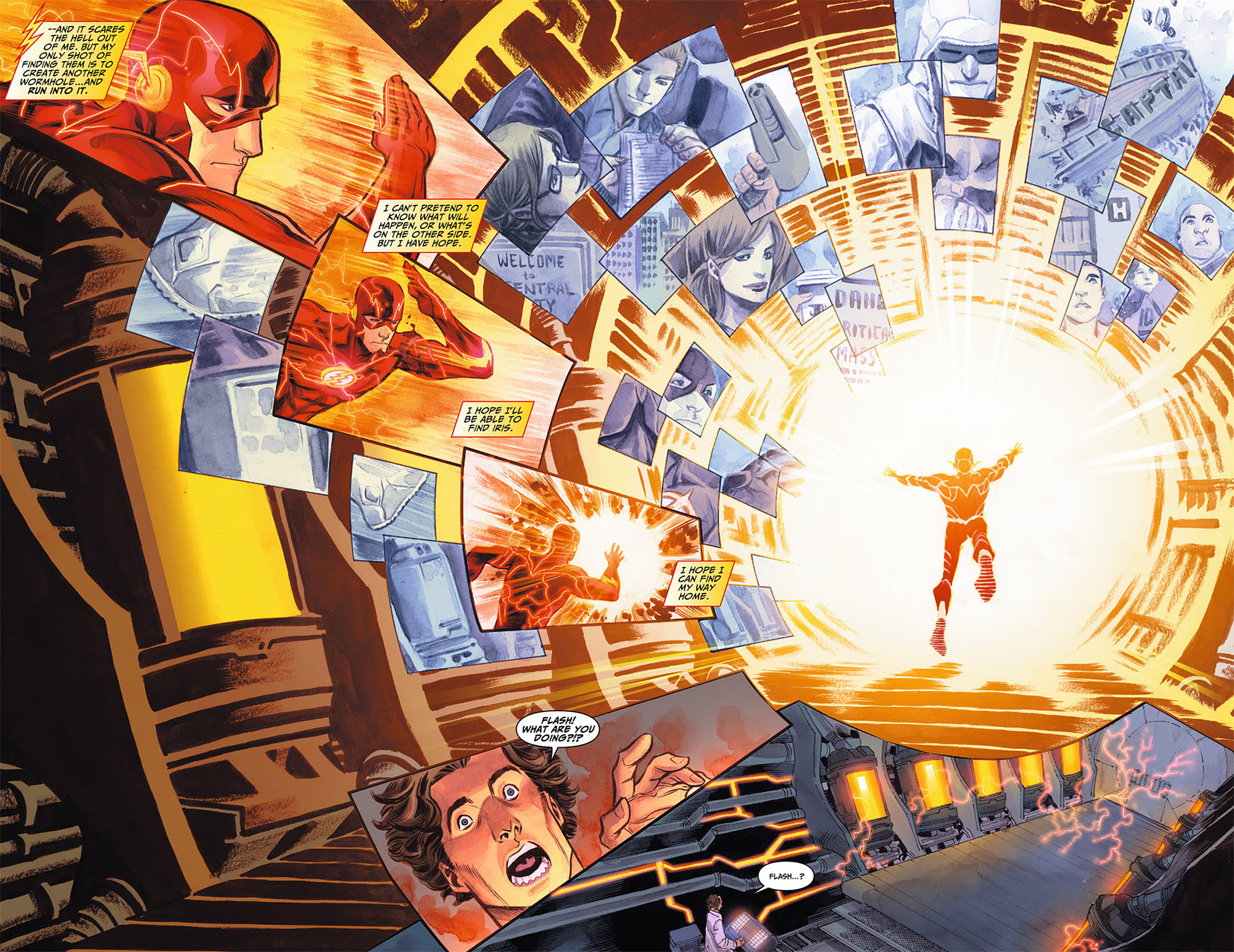 I remember the first time I learned about the “speed force.” It wasn’t in The Flash’s “Tricksters,” which has Harrison Wells talking Barry through the process of tapping into the “speed force” like an alcoholic describing his first drink. It was actually last summer when I leaned on the kindness of my local library to make my way through the entirety of the New 52 version of Flash in the comics, all to prepare for the TV show. I already knew The Flash through Grant Gustin’s Barry Allen on Arrow, the Michael Rosenbaum-voiced Wally West on Justice League/Justice League Unlimited, and Kid Flash on Young Justice. To me, The Flash was mostly the story of a mild-mannered scientist who runs really, really fast in a snazzy red suit, fighting a parade of kind of likable villains who have no real shot against him since most of them don’t have any powers. I found out that time travel is a huge deal in the Flash comics as is the “speed force,” an extra-dimensional energy which actually grants speedsters their power meaning that when they run fast they are not simply responding to some kind of lab-induced mutation but instead tapping into a dimension accessible only by them. It’s also kind of two-way street where the more speedsters there are the stronger the overall speed force (I think).