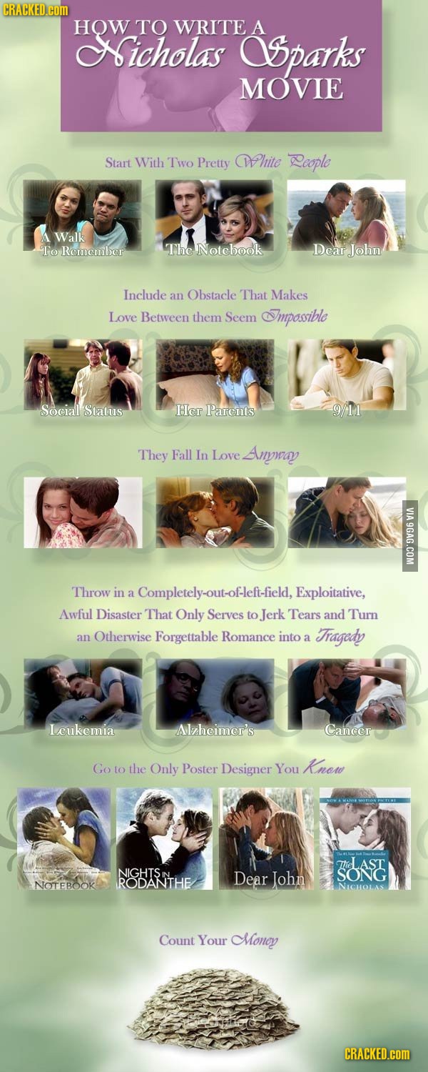 I am in a similar position with Nicholas Sparks. I have never seen any of his movies or read any of his novels, but I get the impression that they’re all the same because everyone jokes about it. Simply Google the phrase “All Nicholas Sparks movies are the same” and you’ll discover that mocking Nicholas Sparks movies has become an internet pastime, with Cracked.com really digging into him because in a USA Today interview “he criticized Shakespeare, Jane Austen, Ernest Hemingway, and romance novelists in general for essentially writing the same story over and over.” So, they made the following graphic to call bullshit: