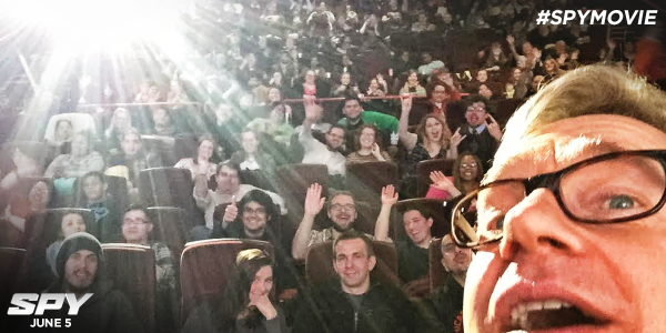 Director Paul Feig taking a selfie from the stage of a pre-release screening of Spy in Chicago