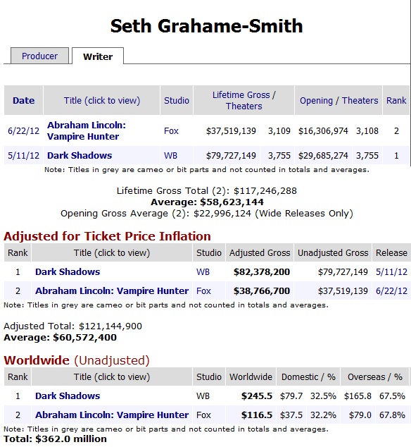 While Pride and Prejudice and Zombies was heating up at the book stores, MTV picked up The Hard Times of RJ Berger, a Smith/Katzenberg co-developed show about a high school kid with an enormous penis. Around that same time, Smith signed a new publishing deal and planned Abraham Lincoln, Vampire Hunter as his next novel. Before he’d even finished writing it, though, Tim Burton gobbled up the film rights, and recruited Smith to not only adapt it to the screen but also to adapt Dark Shadows. Shortly thereafter, Smith and Katzeneberg signed a development deal with WB, and he’s remained one of the hottest writers in town even though his movies haven’t done so well.