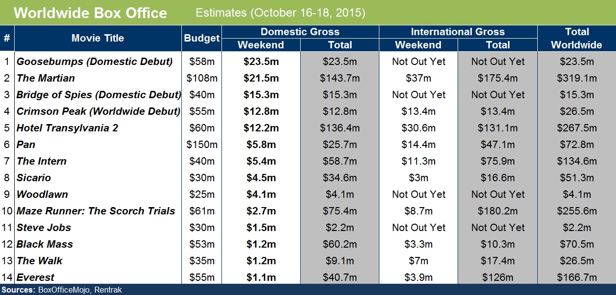 What’s Up Next?: Hollywood has arguably overstuffed October as a way of yielding all of November to Spectre, Hunger Games and The Good Dinosaur because we’re already looking at an crowded marketplace and next weekend brings us four new wide openings (Jem and the Holograms, The Last Witch Hunter, Paranormal Activity: The Ghost Dimension, Rock the Kasbah) and one wide expansion (Steve Jobs).