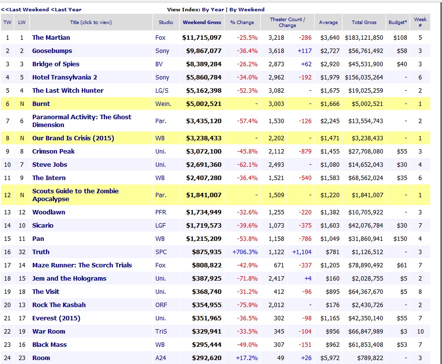 There were several horror movies (Crimson Peak, Scouts Guide to the Zombie Apocalypse), adult dramas (Bridge of Spies, Truth, Rock the Kasbah, Steve Jobs, Our Brand is Crisis, Burnt) and special effects event releases (The Walk, The Martian) duking it out. Usually when there’s a glut of similar product in the marketplace the takeaway is that the studios divided the audience too much, leaving too many movies struggling to find some oxygen. However, you also have to go case-by-case to see if that’s really true: