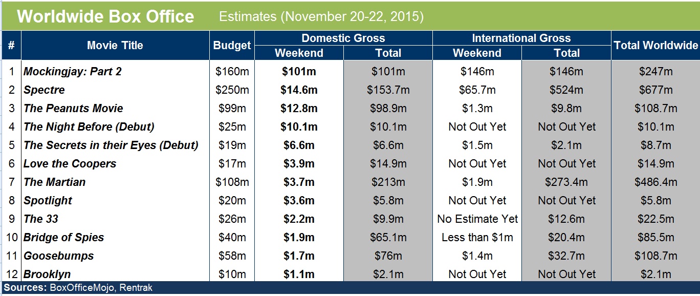 The Hunger Games: Mockingjay – Part 2 is going to be criticized plenty for only making $101 million at the domestic box office this weekend. It is easily the weakest debut in franchise history, well behind the prior low water mark, Mockingjay – Part 1 ($121 million). However, before we give into that can we just take a moment to remember that a $100 million opening weekend is still impressive? Only 32 other movies have done it before, and only 19 had done it before the first Hunger Games stunned everyone by debuting to $152 million in 2012, the third biggest opening weekend of all time to that point. On the other hand, that also means that 12 movie openings, including Mockingjay 2, have cracked $100 million since the first Hunger Games. So, clearly, it’s not quite the achievement it used to be, not in the age of 3D/IMAX-inflation. Still, let’s not lose sight of the fact that with a domestic debut of $101 million Mockingjay 2 is well on its way to easily eclipsing its budget (thought to be around $160 million), and Thanksgiving, a holiday the franchise has historically dominated, is right around the corner.