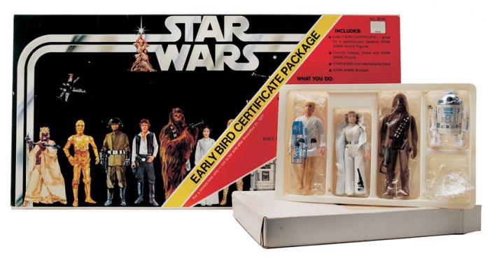 As argued in Plastic Galaxy: The Story of Star Wars Toys, this need to collect Star Wars toys actually started when the Ohio-based toy company Kenner won the Star Wars contract from Fox after Hasbro and Mattel passed. Like the rest of the entertainment industry, they were ill-prepared for the cultural phenomenon to come. To work around their inability to get Star Wars action figures in stores in time for Christmas 1977, Kenner created the Early Bird Certificate Package. As DenOfGeek recently explained, “Advertised on television and in newspapers, the package retailed for around $10-15 and contained a Star Wars Space Club membership card, a cardboard display stand depicting 12 Star Wars characters, and a rather apologetic set of stickers. Most importantly of all, there was the certificate itself: a postcard which, when filled in and sent off, promised to send back a set of four Star Wars figures before the spring of 1978.”