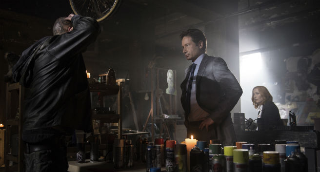 What does a killer trash monster created by a rough analogue for Banksy have to do with the child Scully and Mulder had together and subsequently gave up for adoption? Well, nothing directly, but that doesn’t stop a scattered but emotionally well-meaning episode of The X-Files from working extra hard to create a plausible through line between the two, setting up a situation in which little William (now medium-sized William, probably) is oft referenced in relation to the concept of parents (i.e., creators) taking responsibility for their offspring (i.e., creations). It’s a through line that tries very hard to convince the viewer of its validity, comparing children given up for adoption with estranged sons and, finally, progeny that is willed into existence and emerges from stenciled art pieces to literally rip profit-minded individuals limb from limb.
