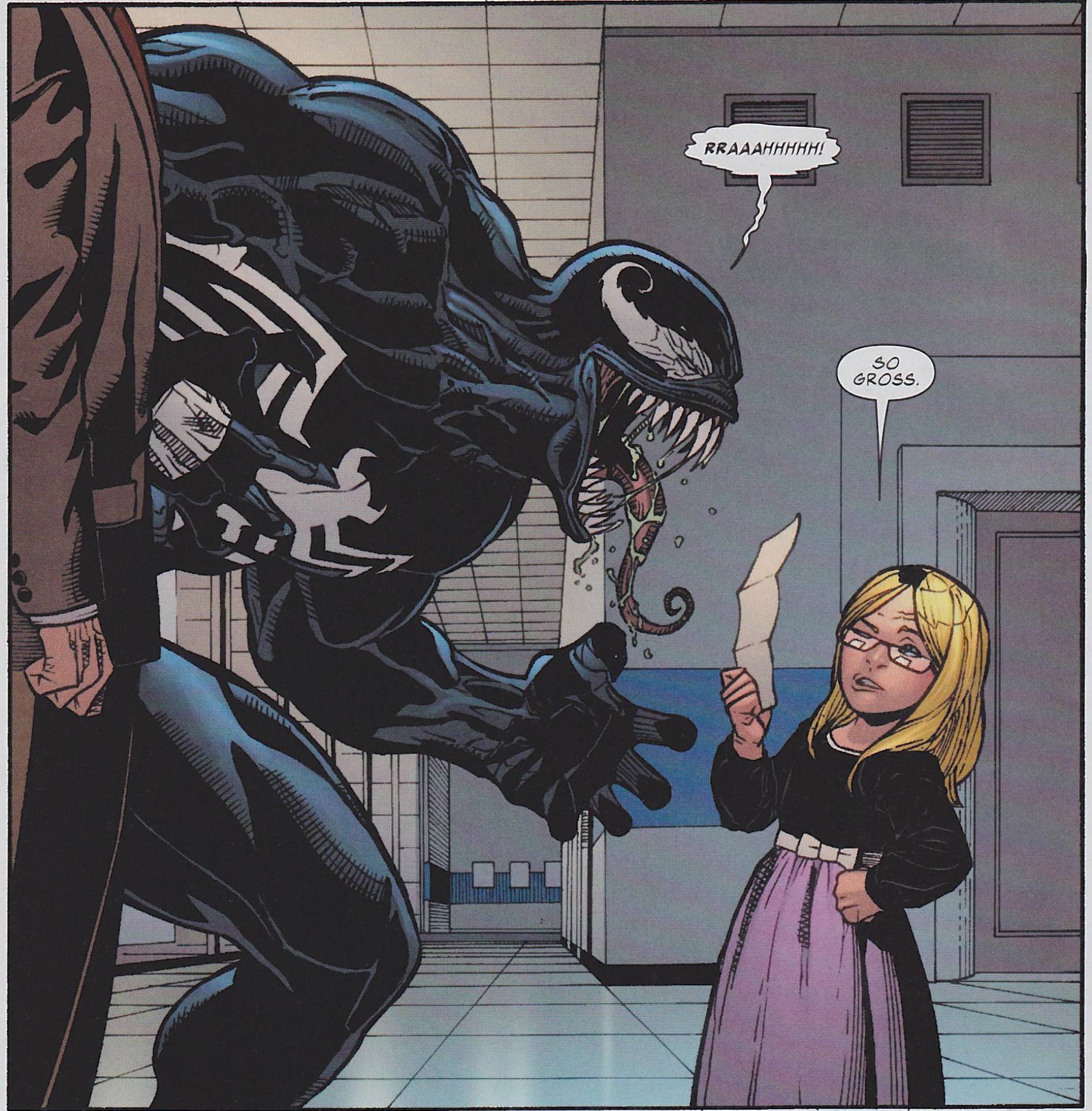 Somewhere along the way, Venom had two different female hosts (Eddie Brock’s ex-wife, a U.S. Army specialist) as well as an additional male host (a mafia boss’ son) who fell to his death after the symbiote abandoned him.