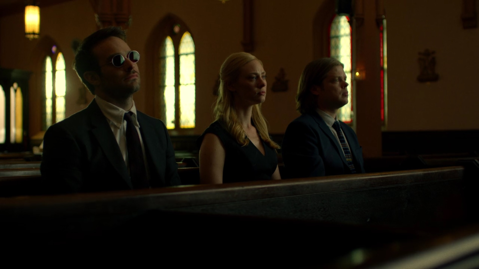 This was an episode which began with our heroes in a church and ended with our new anti-hero recounting his sad lifestory while leaning against a headstone in a cemetery. Then as the police took him away on a stretcher the camera panned up to a splash page image of Daredevil perched atop a Catholic statue-adorned gateway overlooking the cemetery. Somewhere in-between there Matt confessed to feeling guilty for not doing enough to save Grotto, despite his priest’s attempts to let him off the hook. Foggy even made a Catholic joke when Matt looked too happy at the end.