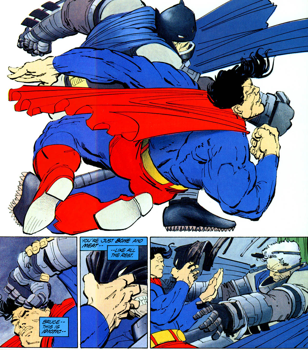 The difference is Nolan is a smart filmmaker who actually did make a superhero trilogy with substance and depth. Frank Miller understood Batman and Superman’s conflict could be character-based and a reflection of their differing worldviews. Batman wants to punish the guilty; Superman wants to save the innocent. Zack Snyder….um…thought it was really cool when Batman punched Superman.