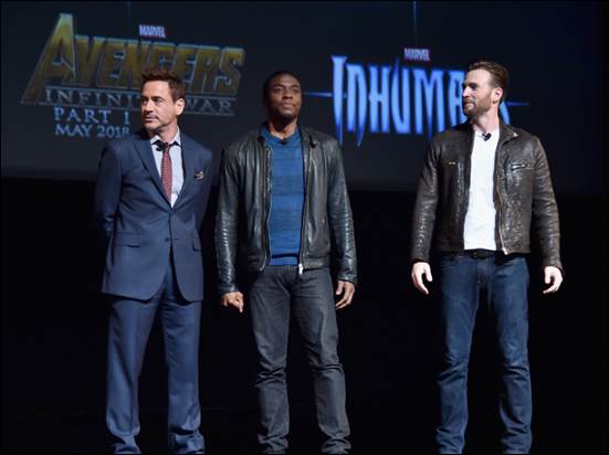 Evans and Downey, Jr. emerging from the shadows and joining Feige on stage was the exclamation point on the end of an amazing day. Boseman eventually joined them on stage, and at the end Evans and Downey, Jr. posed like boxers at the end of a weigh-in, previewing the Cap-Iron Man fight to come.