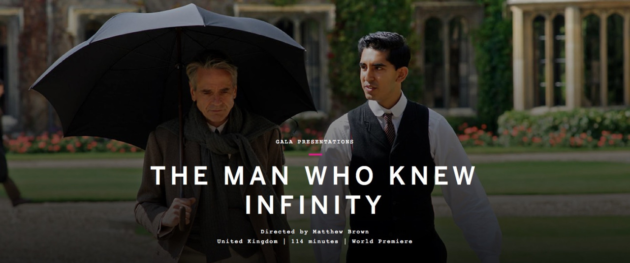 IMDB Logline: Growing up poor in Madras, India, Srinivasa Ramanujan Iyengar (Dev Patel) earns admittance to Cambridge University during WWI, where he becomes a pioneer in mathematical theories with the guidance of his professor, G.H. Hardy (Jeremy Irons).
