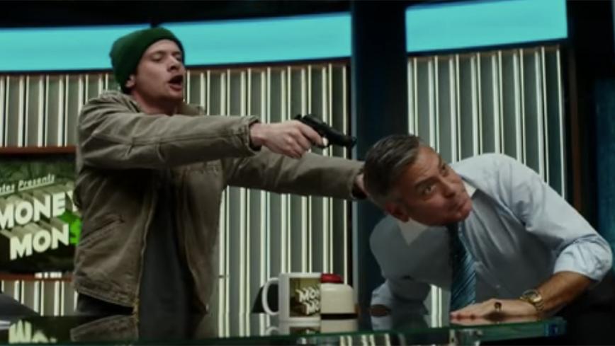 Early on during a live broadcast of the latest Money Monster episode, a mysterious man (Kyle, played by Jack O’Connell) pops up on set, pulls out a gun and forces Lee to put on a bomb vest.