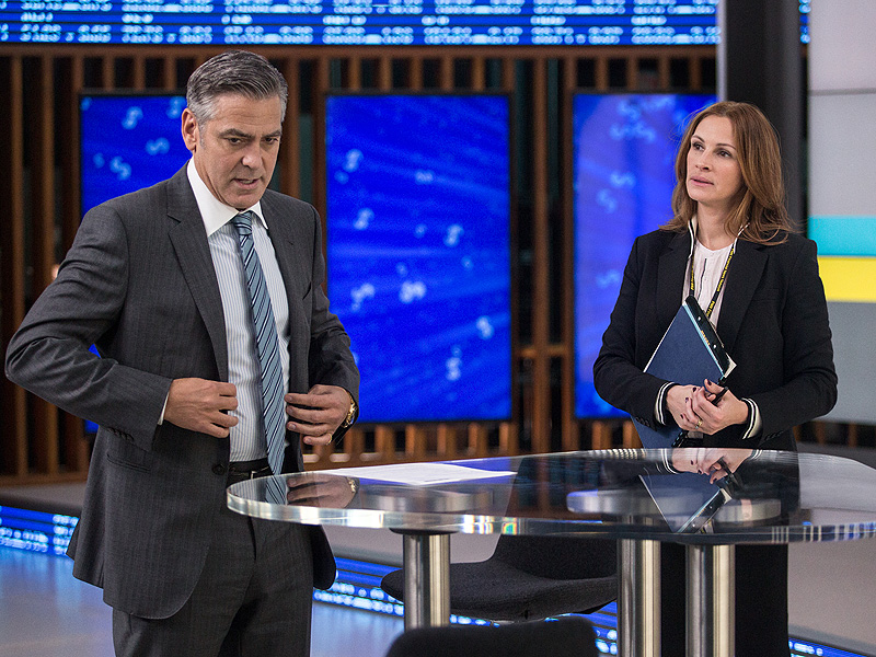 George Clooney is Jim Cramer Lee Gates, the host of Mad Money Money Monster, an over-the-top, financial advice infotainment show where stock tips come only after the host, flanked by gorgeous women, shakes his hips like a middle-aged jackass. Julia Roberts is Patty Fenn, Lee’s longtime producer and the obviously patient woman behind the great successful man. Lee never eats alone whereas Patty does so almost exclusively, at least since her divorce from a referenced, but never-seen ex-husband. Their partnership is nearing its end, although Lee may not be aware of that, and they might just go out with a big bang. Literally.