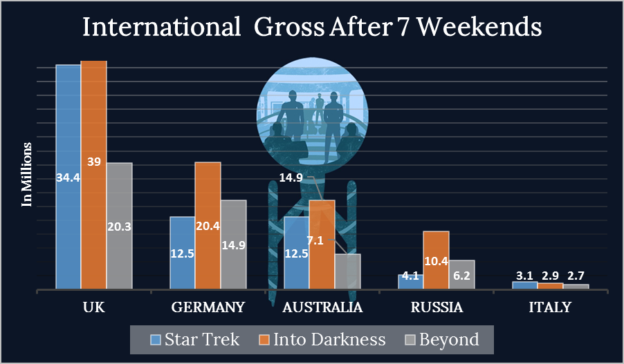 Those are the 7 biggest international markets Beyond opened in at the same time as its domestic debut, and it has flamed out in almost all of them, at least compared to Into Darkness. Over the past two weeks, Beyond has expanded to several significant territories like South Korea, France and Spain, but the “falls short of Into Darkness” pattern has persisted in each one.