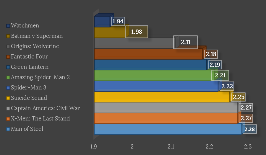 A high or low multiplier doesn’t always directly correlate to box office failure or success, but it does usually speak to a film’s long-lasting critical reputation. Obviously, the higher the multiplier the better since it means the more you were able to make after your marketing-manufactured opening weekend. Among relatively recent comic book movies, Batman Begins (4.24x), Guardians of the Galaxy (3.53x), The Dark Knight (3.37x) and Iron Man (3.22x) represent the multiplier ceiling and Elektra (1.90x), Jonah Hex (1.94x), Watchmen (1.94x) and Batman v Superman (1.98x) the floor.