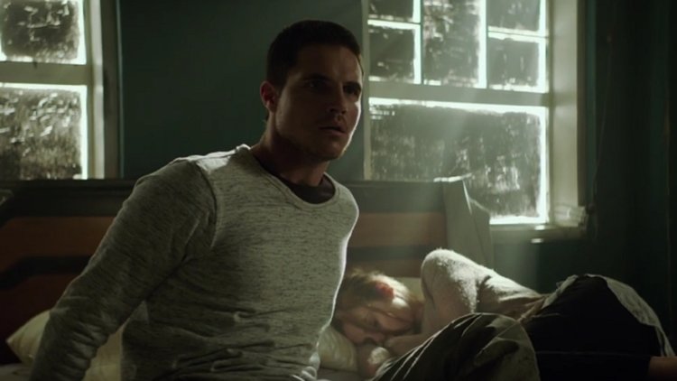 A guy (Robbie Amell) suddenly awakes in his bed, fully dressed and on top of the covers. He quickly checks the clock on his nightstand before rolling over to admire the beauty of the girl (Rachael Taylor) sleeping next to him. Before he has a chance to wake her up, three masked men break down his bedroom door and knock him out. The next thing the man knows he’s in his own work room, tied to a chair back-to-back with his girlfriend. The masked assailants want something he’s not willing to give, and he only has 5 minutes to change his mind. However, the man will not be intimidated, and quickly hatches a plan to take out his would-be attackers. It backfires, and he dies.