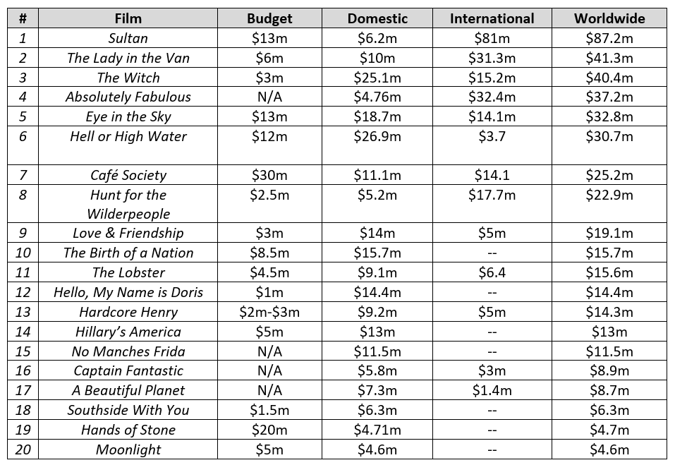 Every Tuesday, the indie film news site uploads a chart of the year’s top 20 indie films, defined as any “indie, foreign (including Bollywood films that open in limited release) and/or documentary — that opened in limited release (599 screens and under) in 2016 and/or were acquired for 2016 distribution by an independent distributor or a studio (or its speciality division).” However, they limit their chart to domestic gross, and don’t include production budgets, thus making it difficult to tell how excited one should really be to see that with a running tally of $26.9m domestic Hell or High Water is this year’s highest-grossing indie film. When you actually know Hell or High Water cost $12m to make you realize $26.9m represents barely breaking even.