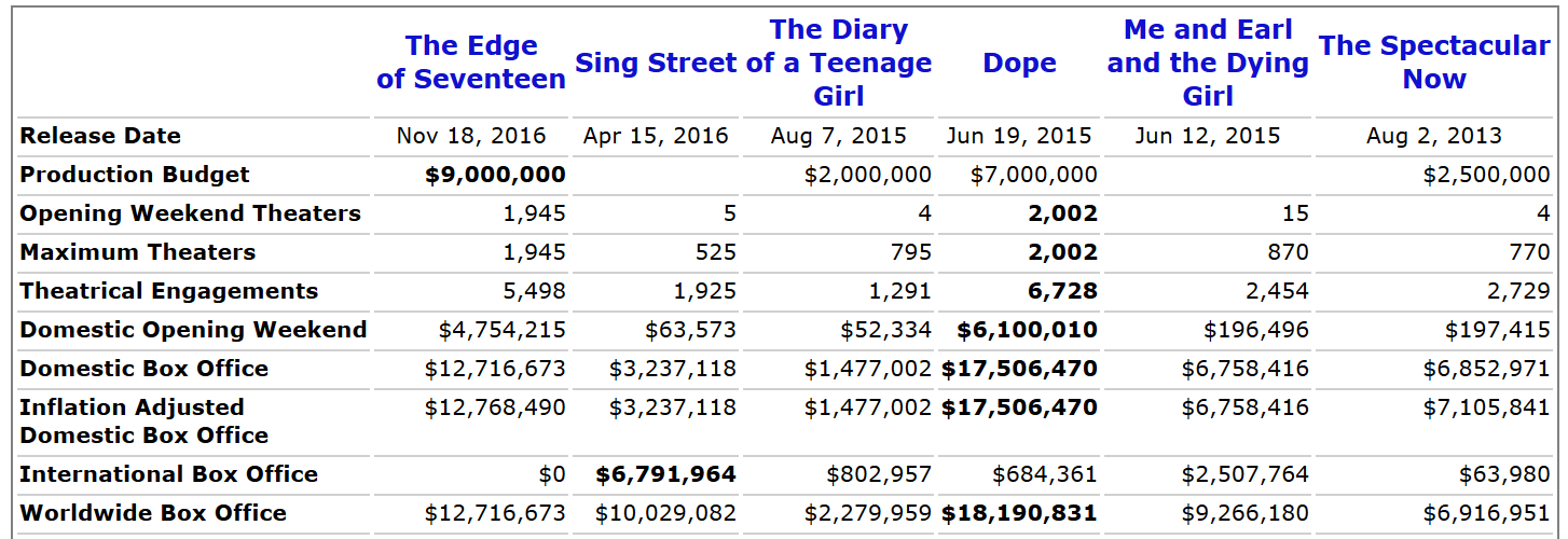 On the plus side, the death of the assembly line high school comedy has given rise to more mature high school and teen-centric movies, usually (though not always) produced through the indie circuit. Edge of Seventeen is but the latest example, distributed by China-backed mini-major studio STX, which is also on the hook for the upcoming The Space Between Us. These kinds of movies are arguably better and more mature than they ever have been before, tackling food insecurity (American Honey), race identity (Dope), alcoholism (The Spectacular Now), sexual abuse (The Perks of Being a Wallflower) and cancer (The Fault In Our Stars).
