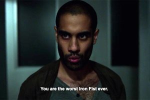 What happened, indeed. I can happily report that the actors who play Joy and Ward get a lot better as the season progresses, to the point that they easily become the most interesting part of the show. As for Finn Jones…yeah, there’s no sugar coating it. He’s awful. What’s different about Iron Fist is that while it superficially resembles multiple other superhero origin stories its main character is almost a complete innocent. There’s meant to be a pureness and naivete to him which would be charming in, say, you’re random dude visiting New York for the first time or coming home after 15 years abroad. However, the fact that it is in the hero of the show becomes a big problem because time after time Danny just seems like a complete idiot, and when he does get mad Finn Jones is incapable of making the anger seem like anything other than a glorified hissy fit (or severe pouting).