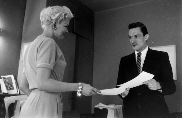 Before long, Hef was so focused on growing Playboy’s popularity he started living at the office at least 2-3 days a week. The escape from his wife and young daughter eventually led him into more of a bachelor lifestyle (even though he’d only ever been with his wife and one other woman to that point). Thus, after nearly a year of working together Hefner and Karalaus began having an affair. Independent of that, she suggested in a routine business meeting that they should stop purchasing their photos from calendars and start producing their own. She wasn’t volunteering to pose for the photos herself, of course, but Hefner seized on the idea, convincing her to do it as a lark and pose under a pseudonym he came up with: Janet Pilgrim.