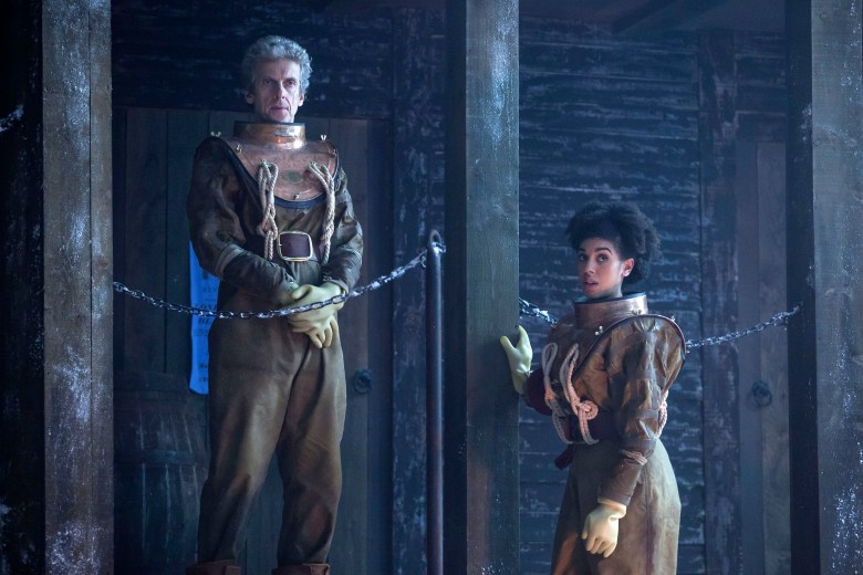 True, but ask Adam Jones or American University students if it feels like old hat in 2017 for a sci-fi show to use its platform to comment on xenophobia and racism. With the world being as scary and small-minded as ever, we still have need of Doctor Who to optimistically search for good in the universe, to look at the seemingly ugly (such as the prehistoric creature under the Thames in “Thin Ice”) and find beauty even if the story is framed in familiar big-guy-exploiting-the-little-guy terms. Or to give us yet another misunderstood villain (as in the season premiere “The Pilot”) but with a fresh twist whereby her motivation revolves around the emotional connection and budding relationship between two lesbians. Or to go all Black Mirror and imagine a “the robots have turned on us” future where the robots only communicate through emoji (as in “Smile”).