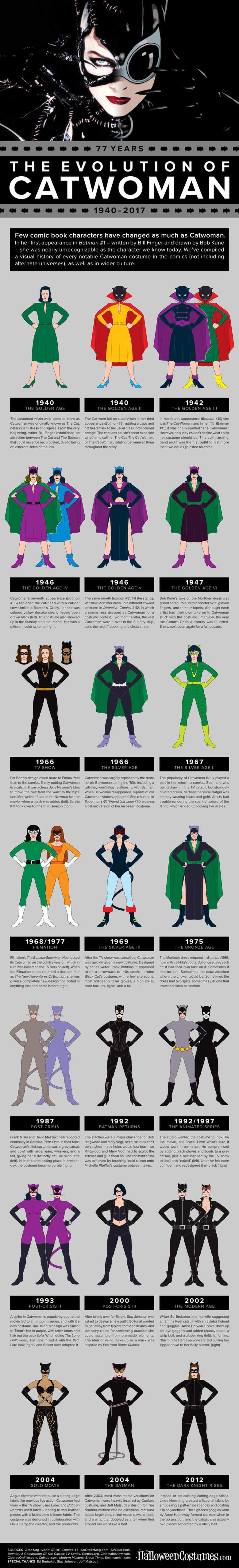 I picture it that way because it amuses me to do so, but I’d be wrong to assume Catwoman would definitely be in her catsuit. That’s the way I’ve known her to roughly look from Batman Returns, Batman: The Animated Series and in everything else in the 25 years since, but thanks to this helpful infographic from my social media pal at HalloweenCostumes I now know that for the majority of the character’s history she looked every different than how we normally picture her. Hell, from the 40s up until the Adam West TV show (and even as late as 1975) she had a cape and cowl. Like with so many things Batman-related, our modern vision of her mostly came from Frank Miller, who was then mimicked by movies, TV shows, video games and future comic book artists. The kickas aviator helmet and glasses which become associated with her in recent years came from…oh, I’m overexplaining. This infographic covers all of that (and more):