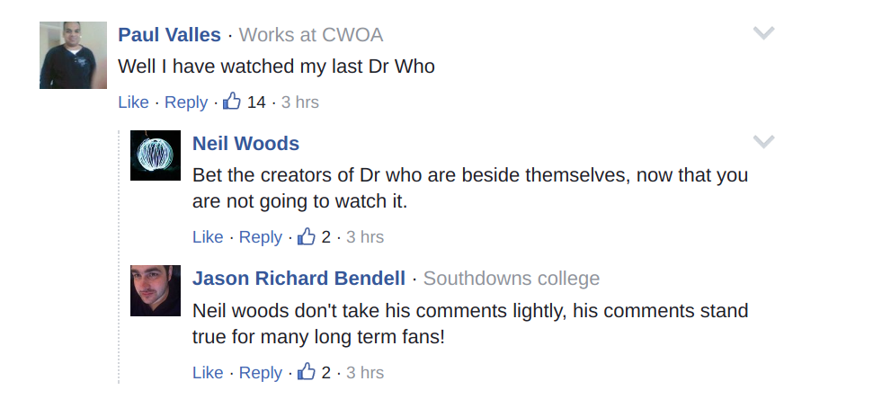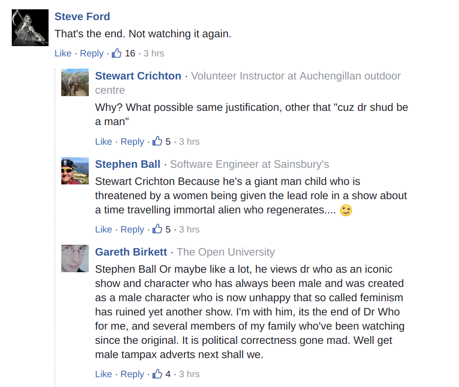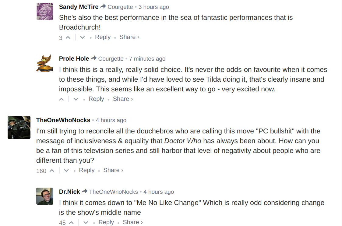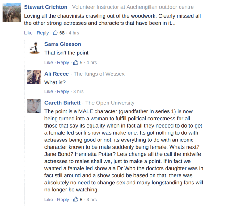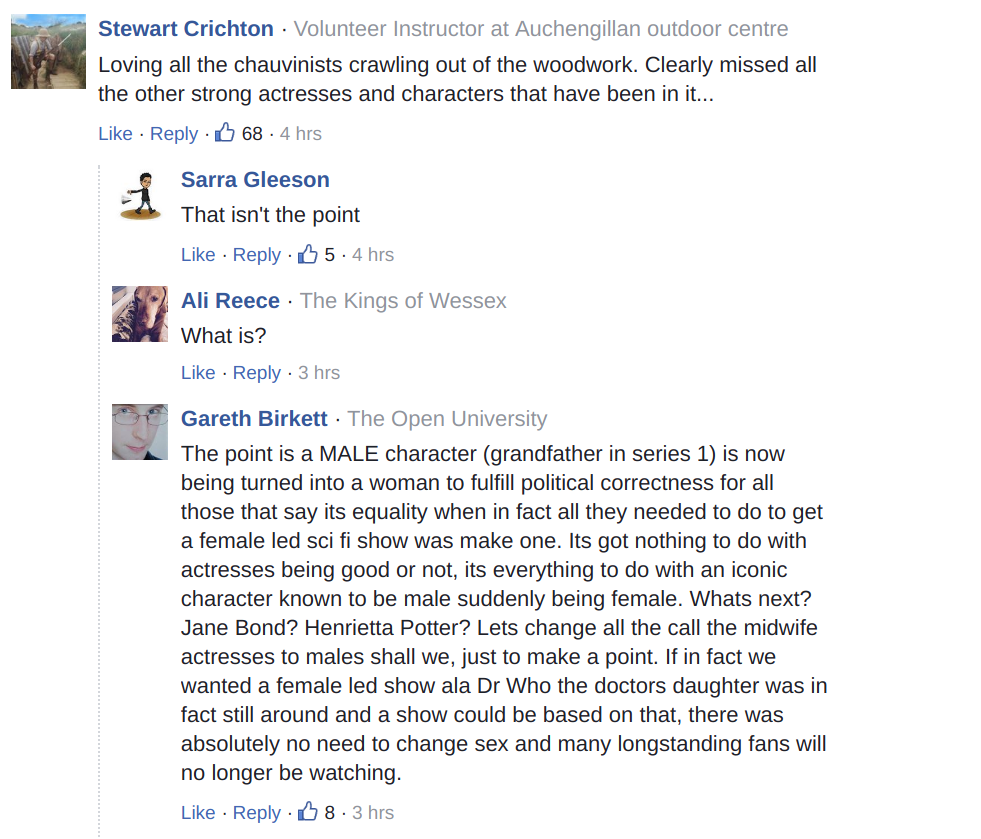 Add on top of all the history-making element of the Doctor being gender-swapped and you get a frustrated fanbase, many of whom are now flocking to comments sections and message boards to declare that Whittaker’s casting means the end of their time as a Whovian.