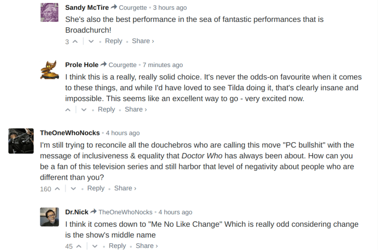 The above comes from the comments section of a Metro.co.uk interview with Whittaker discussing the who, what and when of her casting and future on Doctor Who. When asked what she’d want to tell the fans, she responded, “[Don’t be] scared by my gender. Because this is a really exciting time, and Doctor Who represents everything that’s exciting about change. The fans have lived through so many changes, and this is only a new, different one, not a fearful one.”