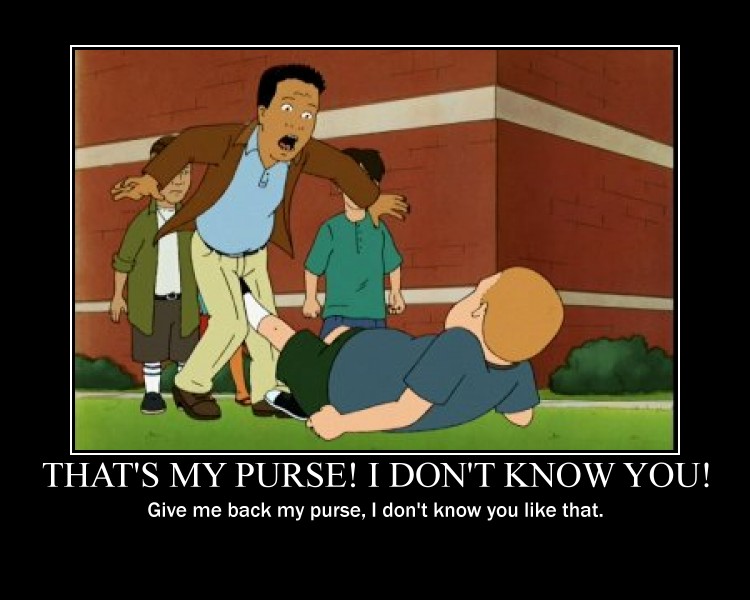 I’ve watched almost all of them and don’t even have to hesitate to pick my favorite moment in the history of the show. It comes in the season six premiere, the perfectly titled “Bobby Goes Nuts.” As per so many King of the Hill episodes, Bobby’s failings to live up to his father’s old-fashioned ideas about masculinity leads to big laughs. In this particular case, after being bullied in school Bobby goes to the YMCA to take a self-defense class, but ends up in a woman’s self-defense class where he learns to shout “That’s my purse! I don’t know you!” before repelling any male attacker with a swift kick to the groin.
