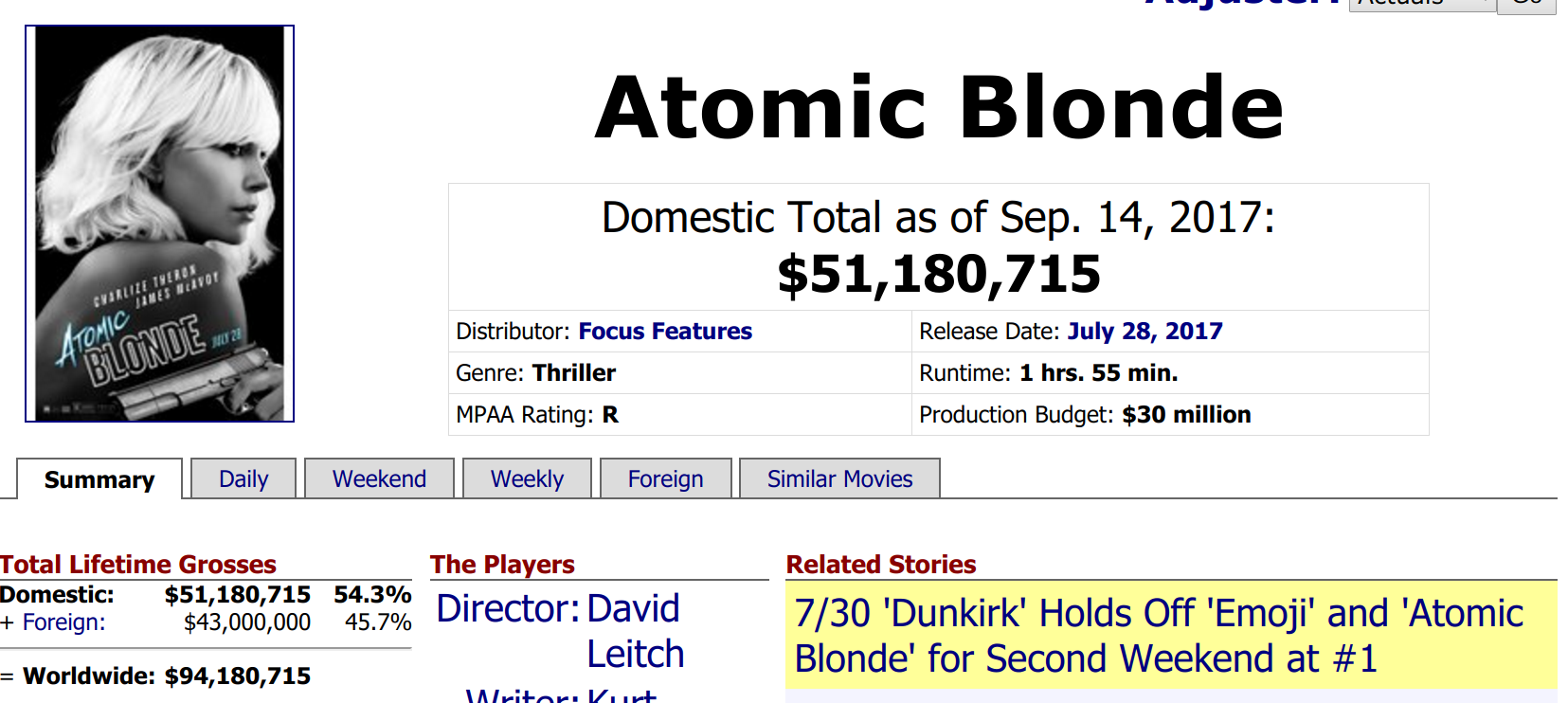 For example, Atomic Blonde was not the breakout hit some expected it to be, but it did slightly improve upon the first John Wick‘s box office: