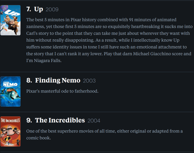 Pixar is a little bit like Marvel in that it is kind of difficult to rank their output. But I guess I can scrunch together at least a top 10.