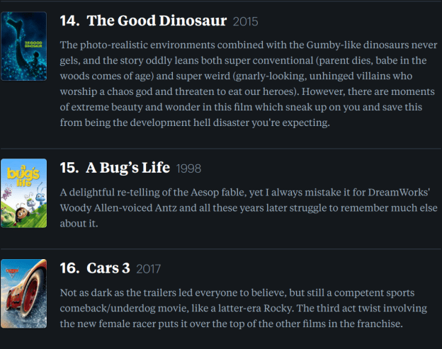 You are right to skip Cars 2 and Monsters University, and if you haven’t gotten around to Good Dinosaur by now it’s probably never going to become a priority viewing option since it is ultimately so very average. Cars 3 is better than you’d expect, but it’s still not up to Pixar par.