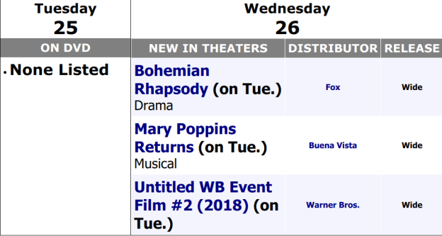 My expectation is if they do push it to December they’ll be doing so under the assumption that some of the competition will simply move out of the way. WB is particularly vulnerable with its DC movies. Maybe Aquaman hightails it and runs. Sony’s animated Spider-Man is a gamble. Bohemian Rhapsody is a troubled production that will likely function as a quasi-jukebox musical (I know it’s a biopic, not a true musical) going up against Disney’s industry-shaking might with Mary Poppins. It stays there simply to get Rami Malek awards consideration, maybe turns into a Platform release delaying its wide release until mid-January ala The Post and Phantom Thread this year.