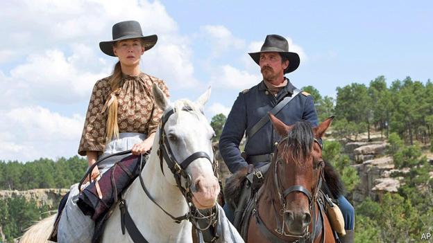Shortly after embarking on their journey, Blocker’s posse picks up a suicidal woman, Rosalie (Rosamund Pike), who just lost her husband, two daughters, and baby to a Comanche raid. In fact, the very opening scene of the film depicts Rosalie running away from her attackers, unaware the baby she’s carrying has been shot dead.