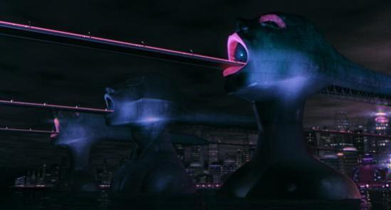 Thus, A.I. was a story which had to wait for the technology to catch up to it, and Kubrick didn’t survive quite long enough for that. That left Spielberg to shepherd the project into the history books, making A.I. the first film to use computer-animated pre-vis and large-scale sections where the only real things on the screen are the actors, such as when Gigolo Joe gives David a tour of Rouge City, a futuristic den of sin with archways mimicking a woman’s mouth: